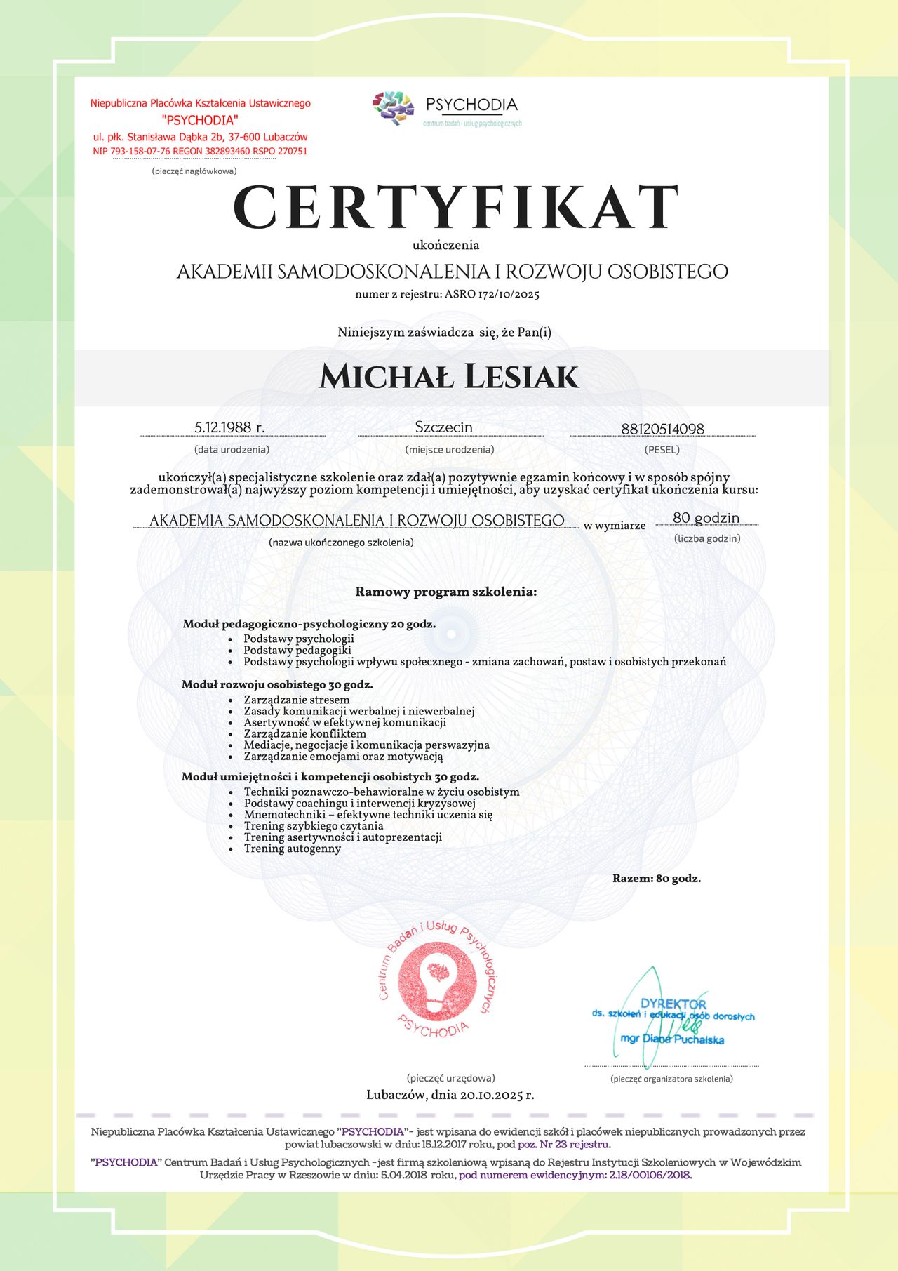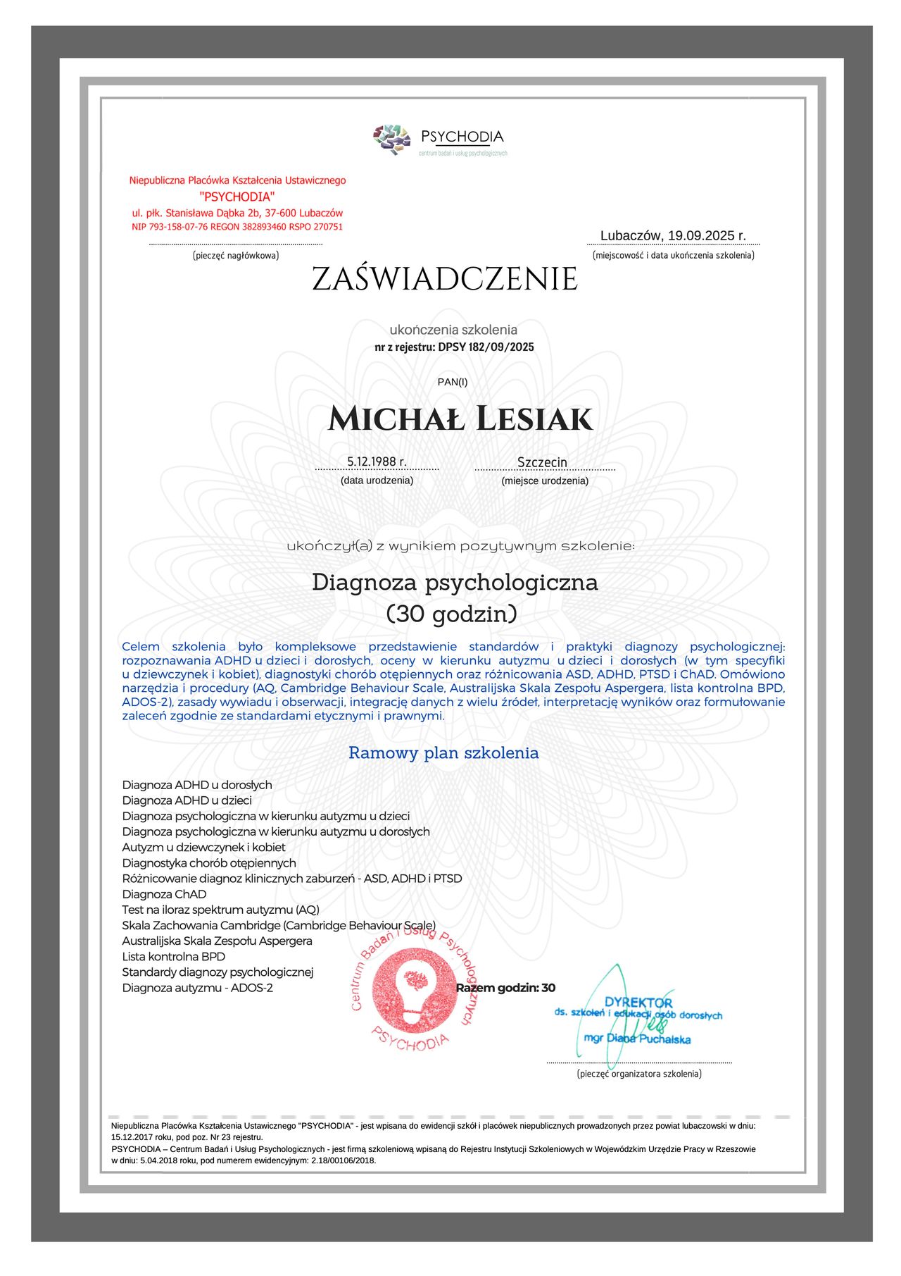 Michał Lesiak to psycholog, który wyróżnia się nie tylko szeroką wiedzą, ale także bogatym doświadczeniem zawodowym. Jako właściciel wielu renomowanych klinik psychologicznych w Polsce, stał się symbolem profesjonalizmu i najwyższych standardów w dziedzinie psychologii. Jego podejście do pracy z klientami łączy zaawansowaną wiedzę teoretyczną z praktycznymi metodami terapeutycznymi, co pozwala na skuteczne rozwiązywanie problemów psychicznych i emocjonalnych.