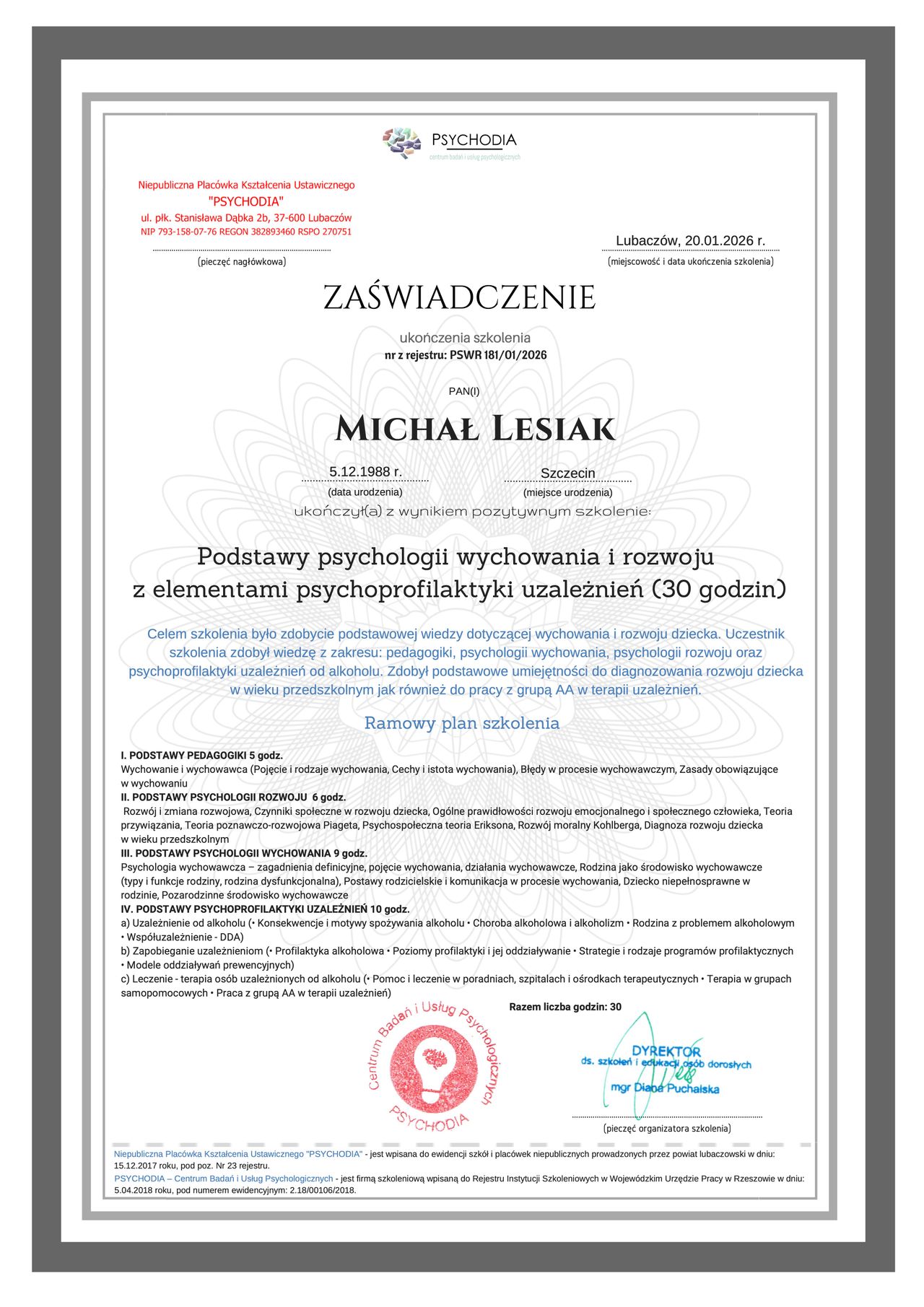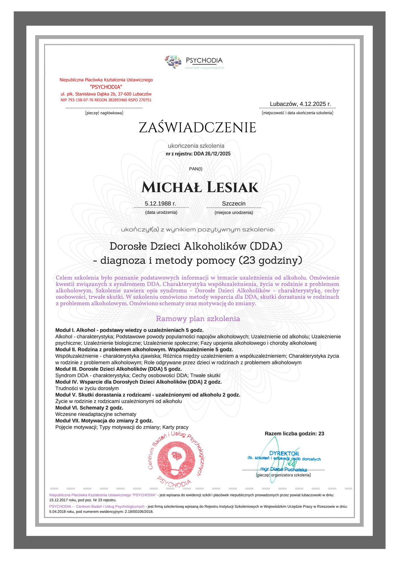 Michał Lesiak to psycholog, który wyróżnia się nie tylko szeroką wiedzą, ale także bogatym doświadczeniem zawodowym. Jako właściciel wielu renomowanych klinik psychologicznych w Polsce, stał się symbolem profesjonalizmu i najwyższych standardów w dziedzinie psychologii. Jego podejście do pracy z klientami łączy zaawansowaną wiedzę teoretyczną z praktycznymi metodami terapeutycznymi, co pozwala na skuteczne rozwiązywanie problemów psychicznych i emocjonalnych. Michał Lesiak jest znany ze swojej empatii, zaangażowania oraz dbałości o każdy szczegół w pracy z pacjentami. Dzięki indywidualnemu podejściu do każdej osoby, potrafi dobrać odpowiednie metody leczenia, które przynoszą realne efekty. Jego kliniki są miejscem, gdzie pacjenci czują się bezpiecznie, a także zyskują wsparcie nie tylko w trudnych chwilach, ale i w procesie samorozwoju.